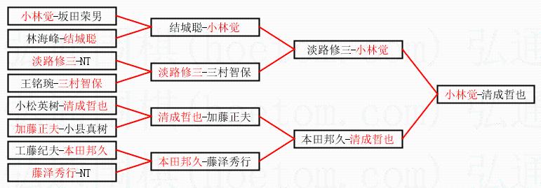 1.小林觉获得冠军,清成哲也获得亚军。决赛比分:小林觉1:0清成哲也。棋局: