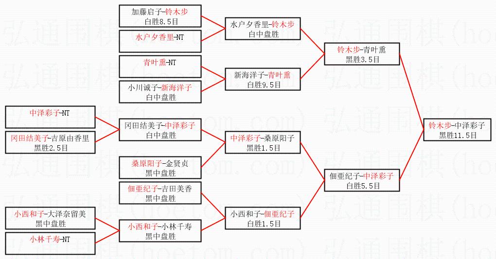 1.铃木步获得冠军,中泽彩子获得亚军。决赛比分:铃木步1:0中泽彩子。棋局:
