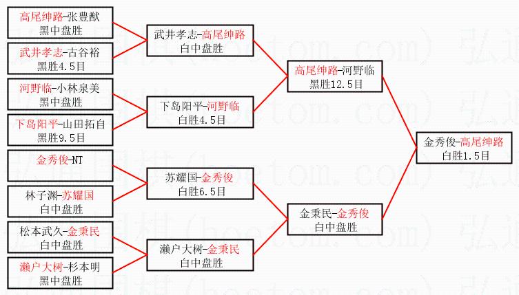 1.高尾绅路获得冠军,金秀俊获得亚军。决赛比分:高尾绅路1:0金秀俊。棋局: