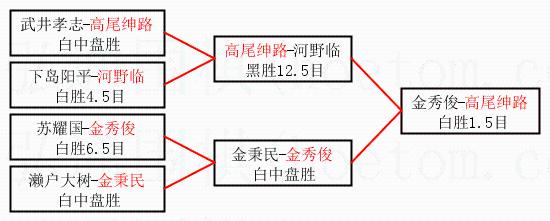 1.高尾绅路获得冠军,金秀俊获得亚军。决赛比分:高尾绅路1:0金秀俊。棋局: