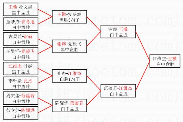 1.王檄获得冠军,江维杰获得亚军。决赛比分:王檄1:0江维杰。棋局: