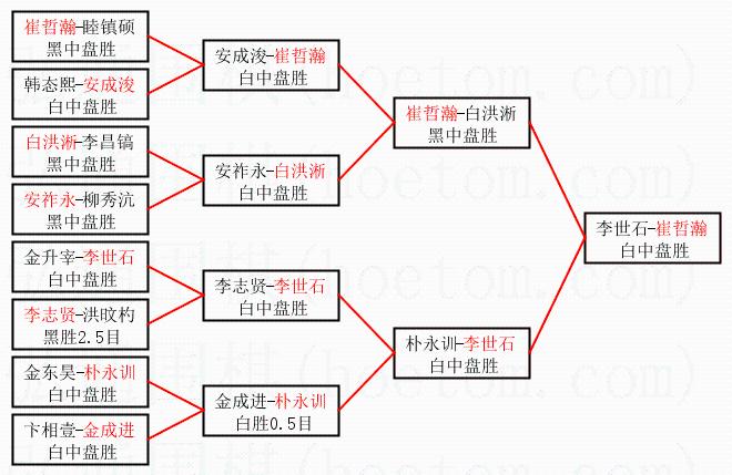 | 1.崔哲瀚获得冠军,李世石获得亚军。决赛比分:崔哲瀚3:2李世石。棋局: | ||