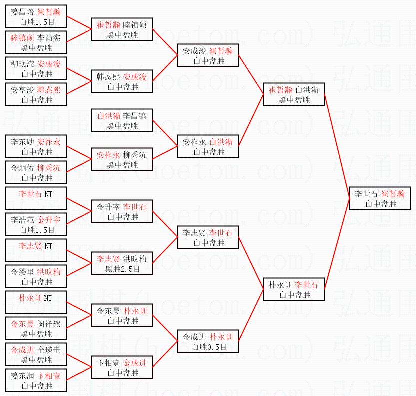 | 1.崔哲瀚获得冠军,李世石获得亚军。决赛比分:崔哲瀚3:2李世石。棋局: | ||