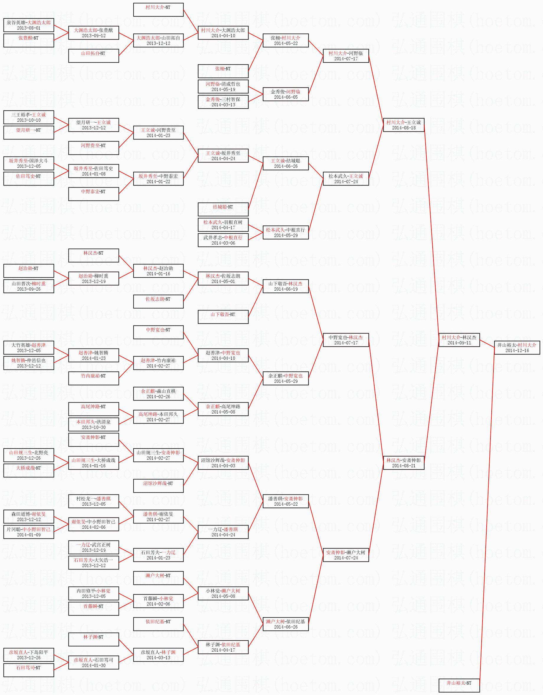 1.村川大介获得冠军,井山裕太获得亚军。决赛比分:村川大介3:2井山裕太。棋局: