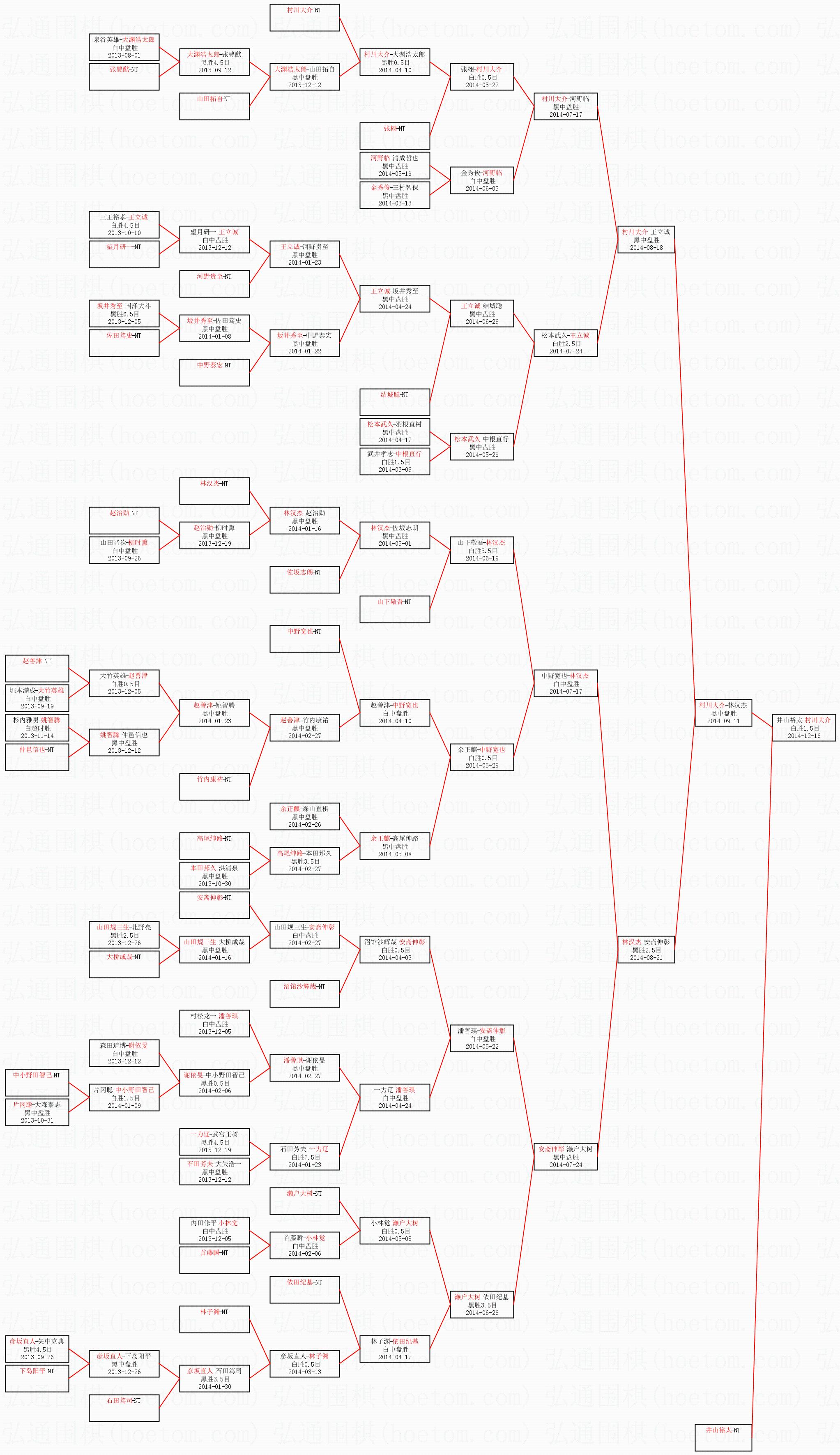 1.村川大介获得冠军,井山裕太获得亚军。决赛比分:村川大介3:2井山裕太。棋局: