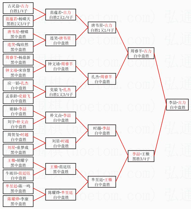 1.古力获得冠军,李喆获得亚军。决赛比分:古力2:1李喆。棋局: