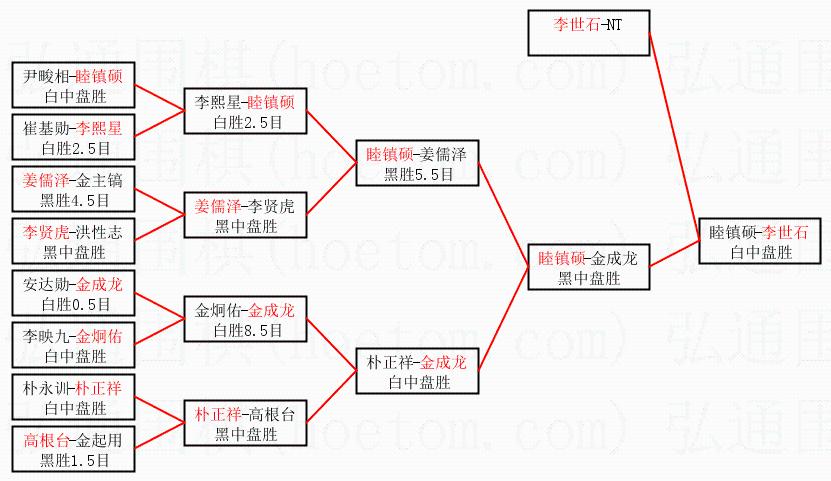| 1.李世石获得冠军,睦镇硕获得亚军。决赛比分:李世石3:1睦镇硕。棋局: | ||