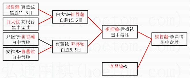| 1.崔哲瀚获得冠军,李昌镐获得亚军。决赛比分:崔哲瀚3:2李昌镐。棋局: | ||