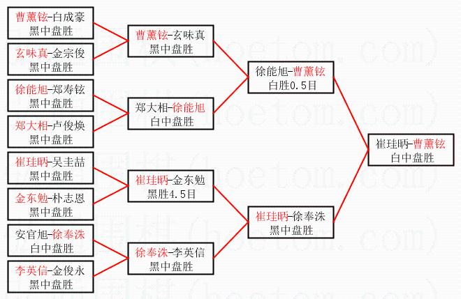 1.曹薰铉获得冠军,崔珪昞获得亚军。决赛比分:曹薰铉1:0崔珪昞。棋局: