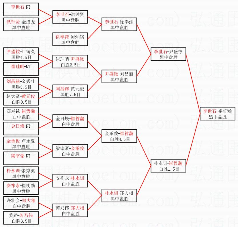 | 1.李世石获得冠军,崔哲瀚获得亚军。决赛比分:李世石2:1崔哲瀚。棋局: | ||