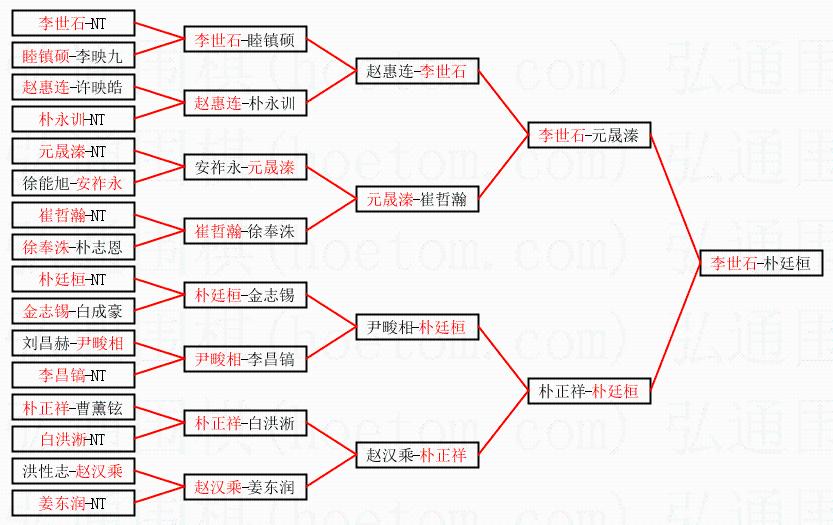 | 1.李世石获得冠军,朴廷桓获得亚军。决赛比分:李世石2:0朴廷桓。棋局: | ||
