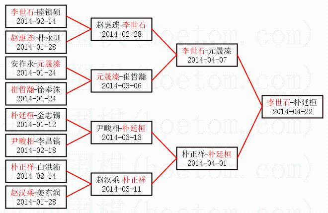 | 1.李世石获得冠军,朴廷桓获得亚军。决赛比分:李世石2:0朴廷桓。棋局: | ||