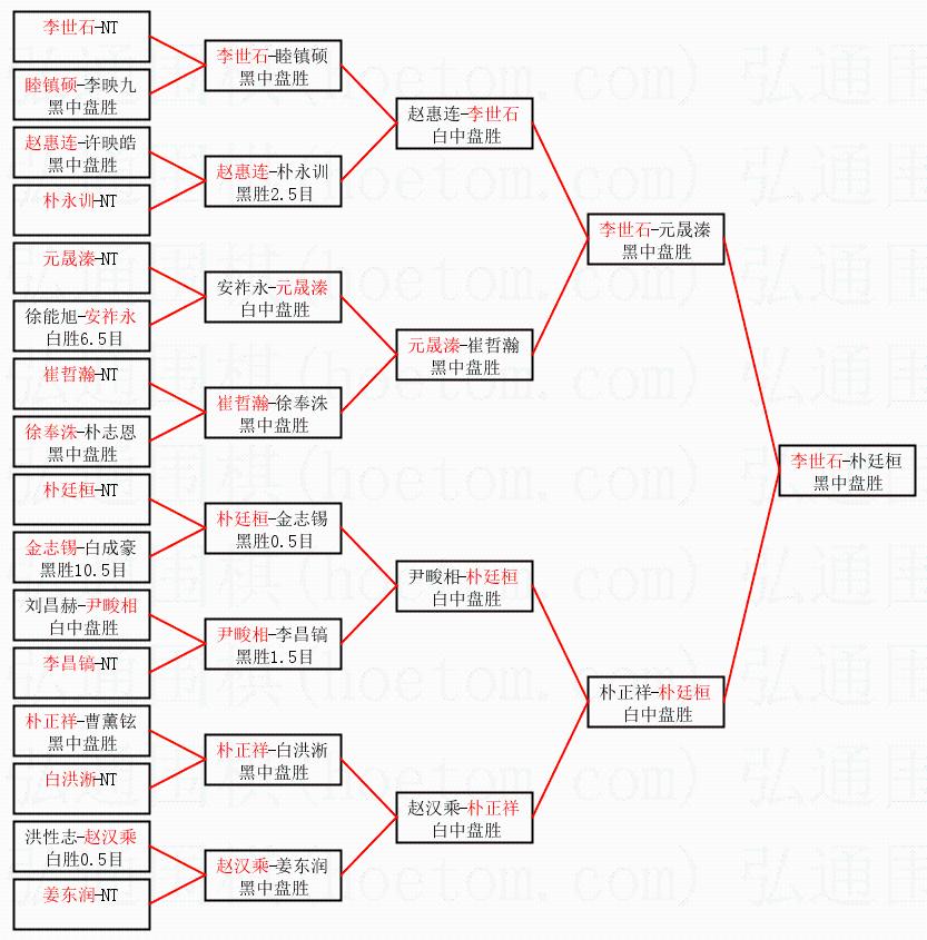 1.李世石获得冠军,朴廷桓获得亚军。决赛比分:李世石2:0朴廷桓。棋局: