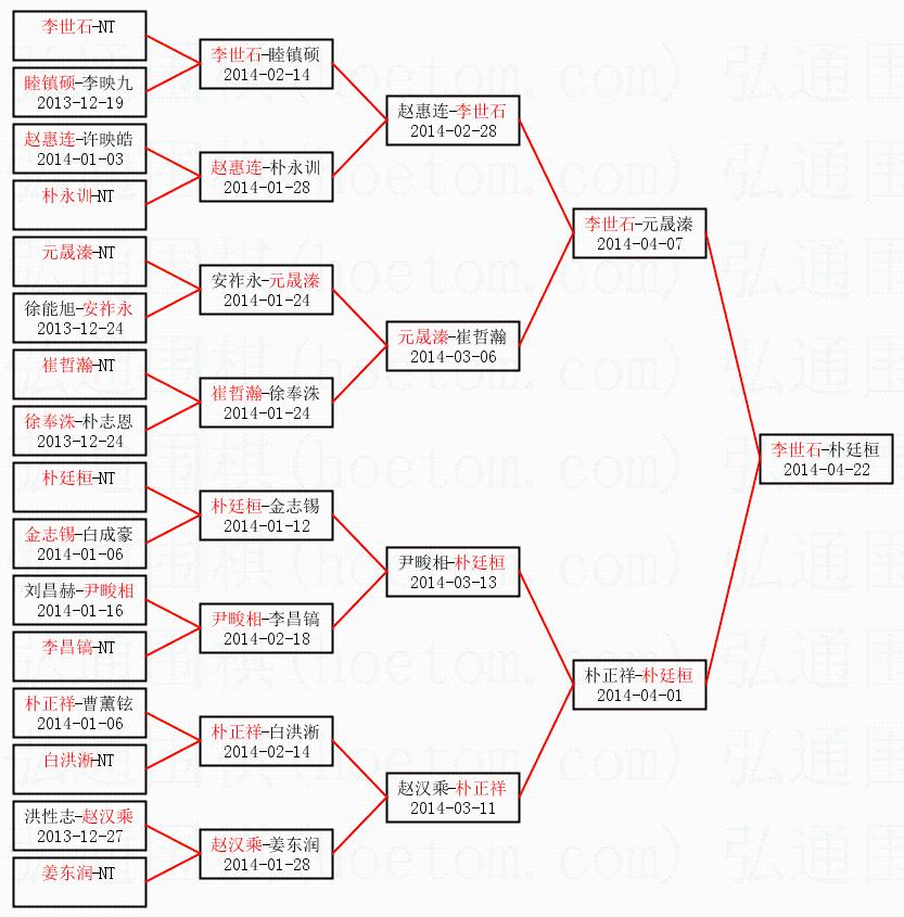 | 1.李世石获得冠军,朴廷桓获得亚军。决赛比分:李世石2:0朴廷桓。棋局: | ||
