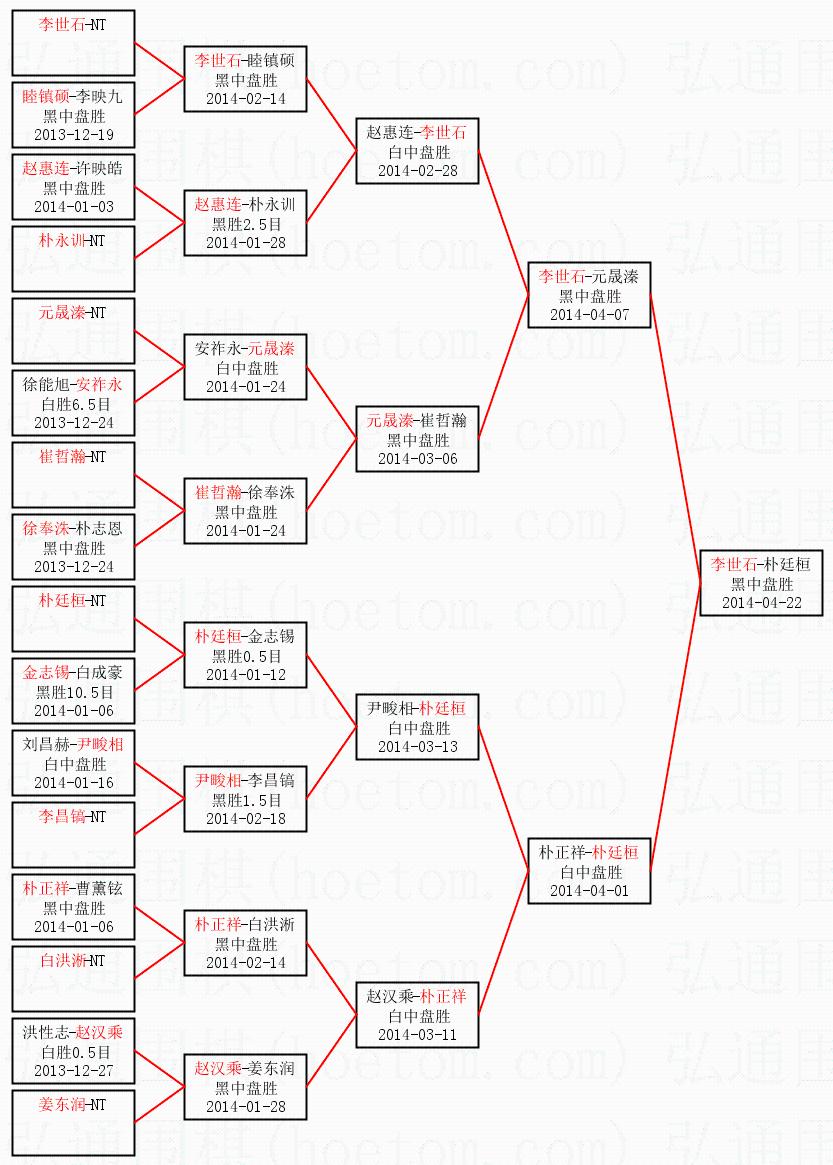 | 1.李世石获得冠军,朴廷桓获得亚军。决赛比分:李世石2:0朴廷桓。棋局: | ||