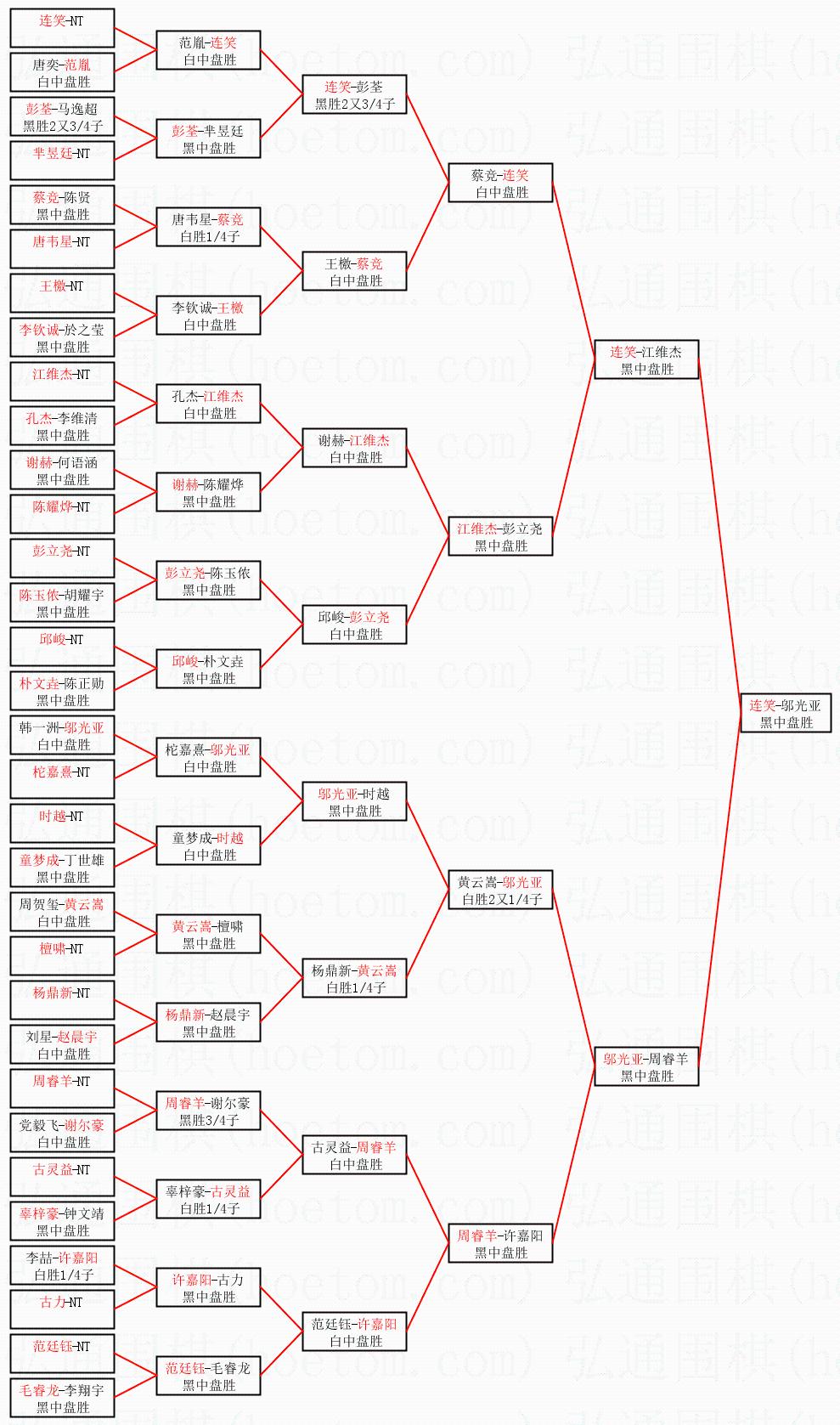 1.连笑获得冠军,邬光亚获得亚军。决赛比分:连笑1:0邬光亚。棋局: