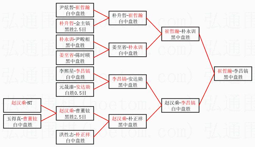 | 1.崔哲瀚获得冠军,李昌镐获得亚军。决赛比分:崔哲瀚3:2李昌镐。棋局: | ||