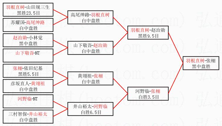 1.羽根直树获得冠军,张栩获得亚军。决赛比分:羽根直树1:0张栩。棋局:
