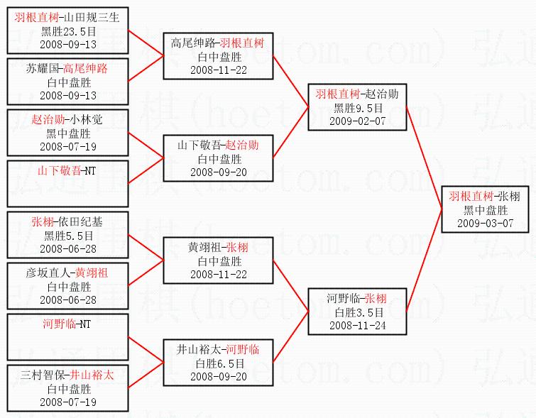 1.羽根直树获得冠军,张栩获得亚军。决赛比分:羽根直树1:0张栩。棋局: