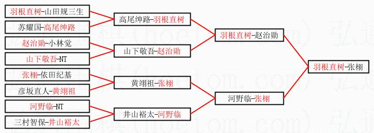 1.羽根直树获得冠军,张栩获得亚军。决赛比分:羽根直树1:0张栩。棋局: