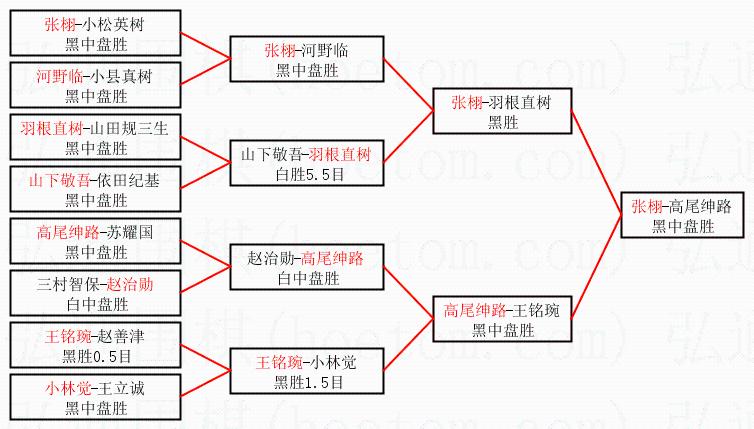 1.张栩获得冠军,高尾绅路获得亚军。决赛比分:张栩1:0高尾绅路。棋局: