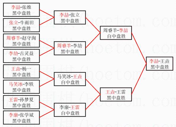 | 2.上半区半决赛李喆获胜, 比分:李喆 1:0 周睿羊。棋局: | ||