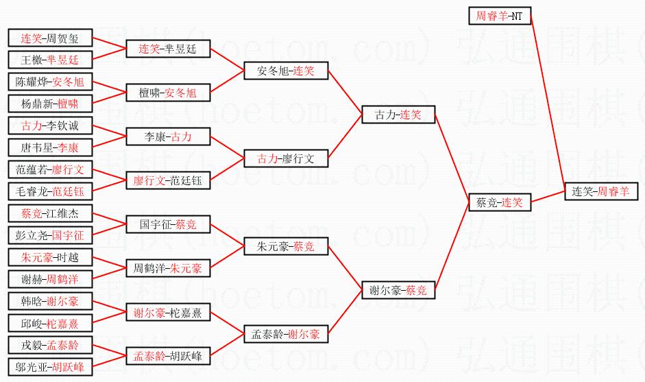 | 1.周睿羊获得冠军,连笑获得亚军。决赛比分:周睿羊3:1连笑。棋局: | ||