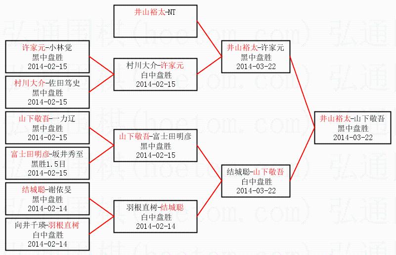 1.井山裕太获得冠军,山下敬吾获得亚军。决赛比分:井山裕太1:0山下敬吾。棋局: