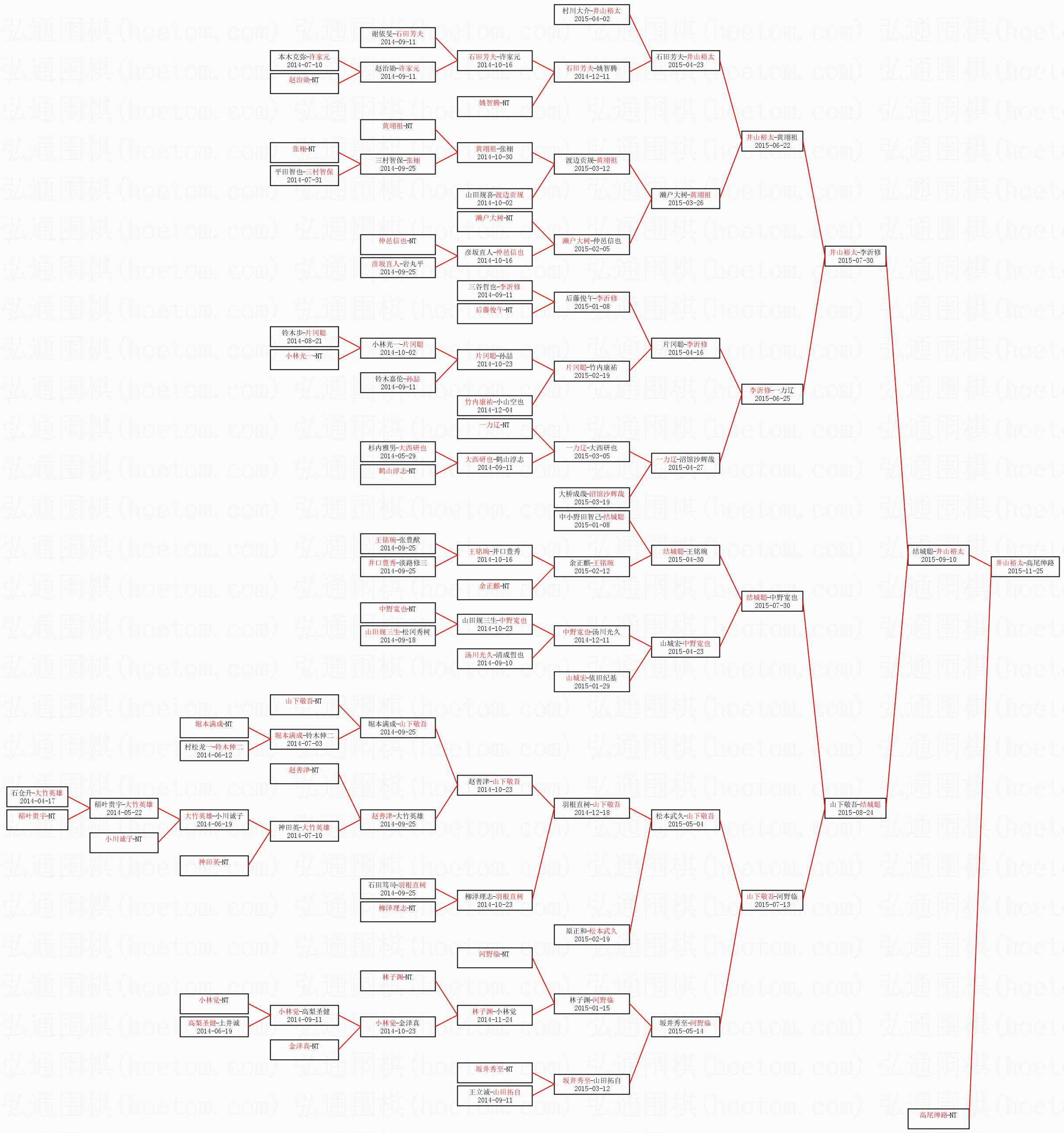 1.井山裕太获得冠军,高尾绅路获得亚军。决赛比分:井山裕太3:0高尾绅路。棋局: