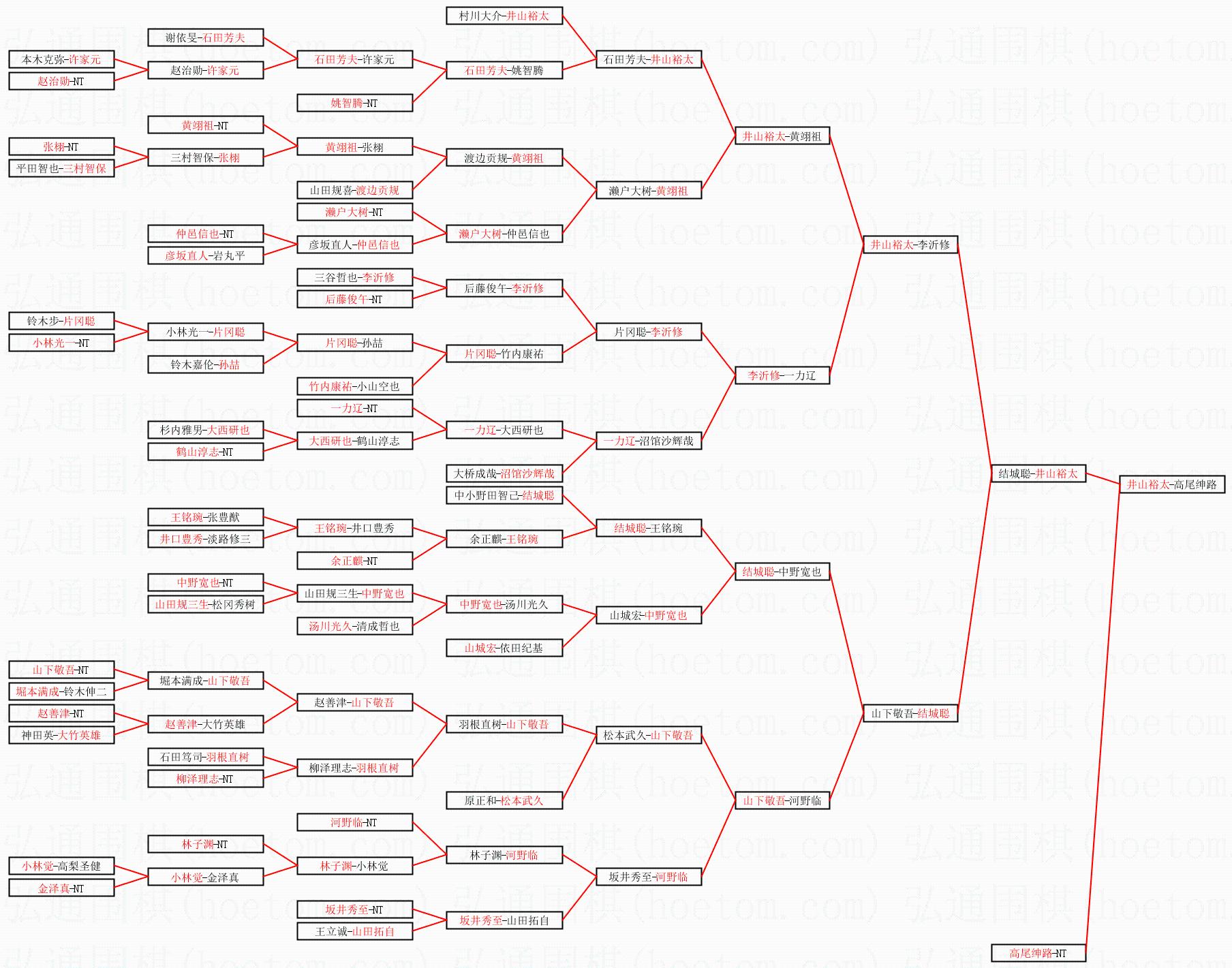 1.井山裕太获得冠军,高尾绅路获得亚军。决赛比分:井山裕太3:0高尾绅路。棋局: