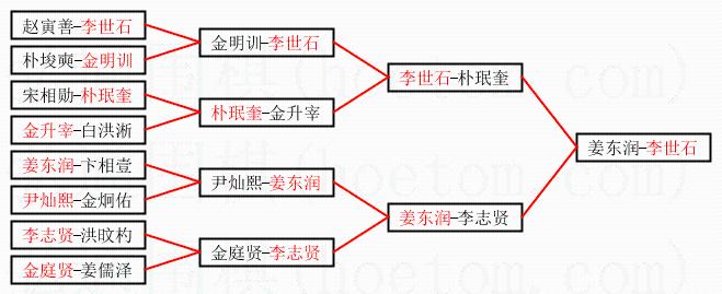 | 1.李世石获得冠军,姜东润获得亚军。决赛比分:李世石2:1姜东润。棋局: | ||