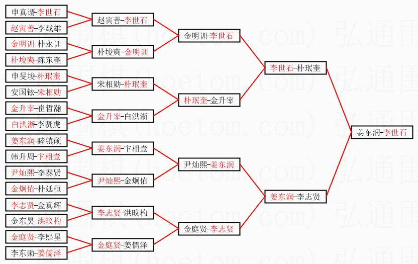 | 1.李世石获得冠军,姜东润获得亚军。决赛比分:李世石2:1姜东润。棋局: | ||