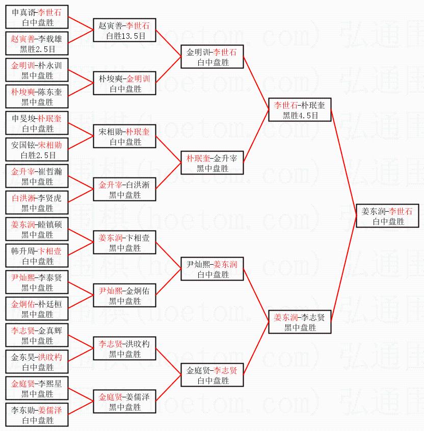 1.李世石获得冠军,姜东润获得亚军。决赛比分:李世石2:1姜东润。棋局: