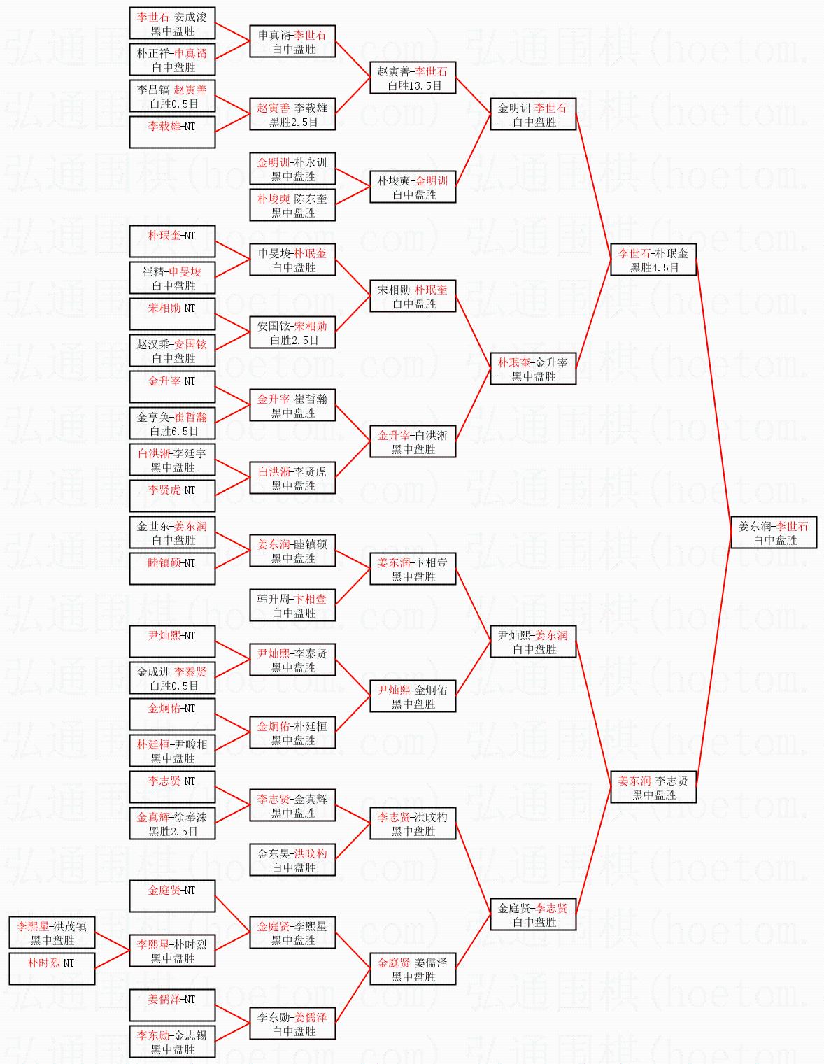 | 1.李世石获得冠军,姜东润获得亚军。决赛比分:李世石2:1姜东润。棋局: | ||