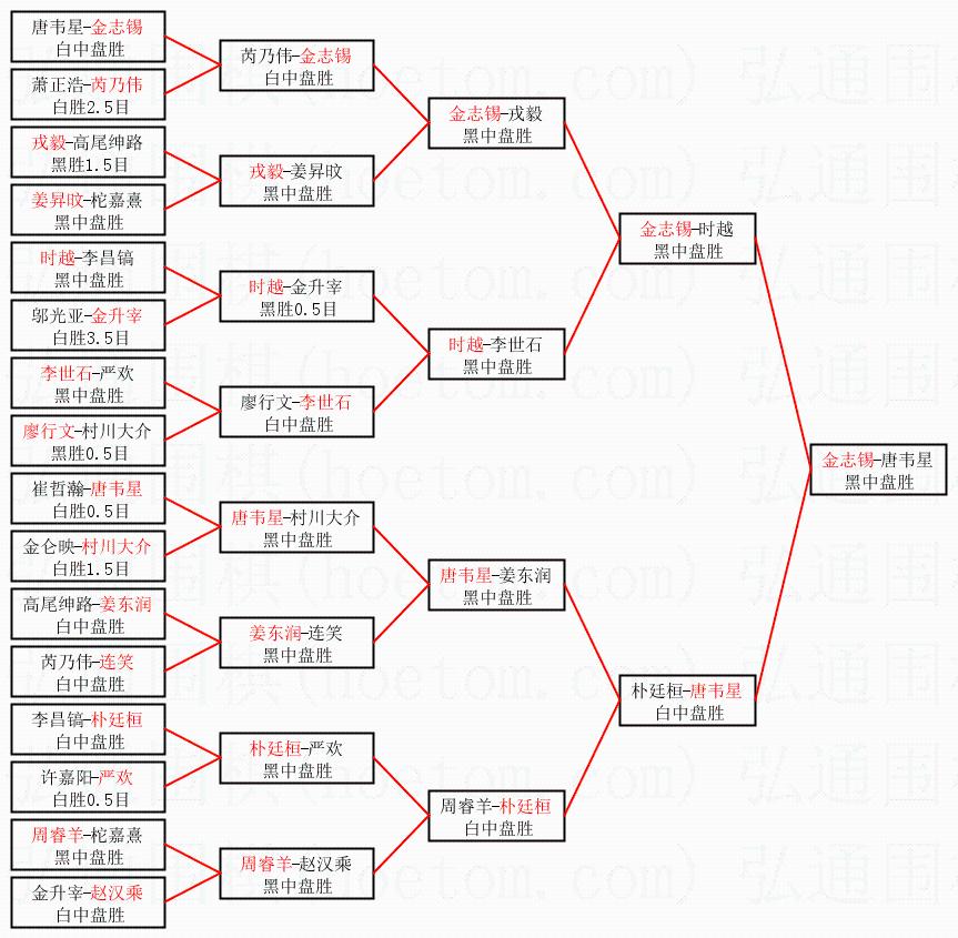 1.金志锡获得冠军,唐韦星获得亚军。决赛比分:金志锡2:0唐韦星。棋局: