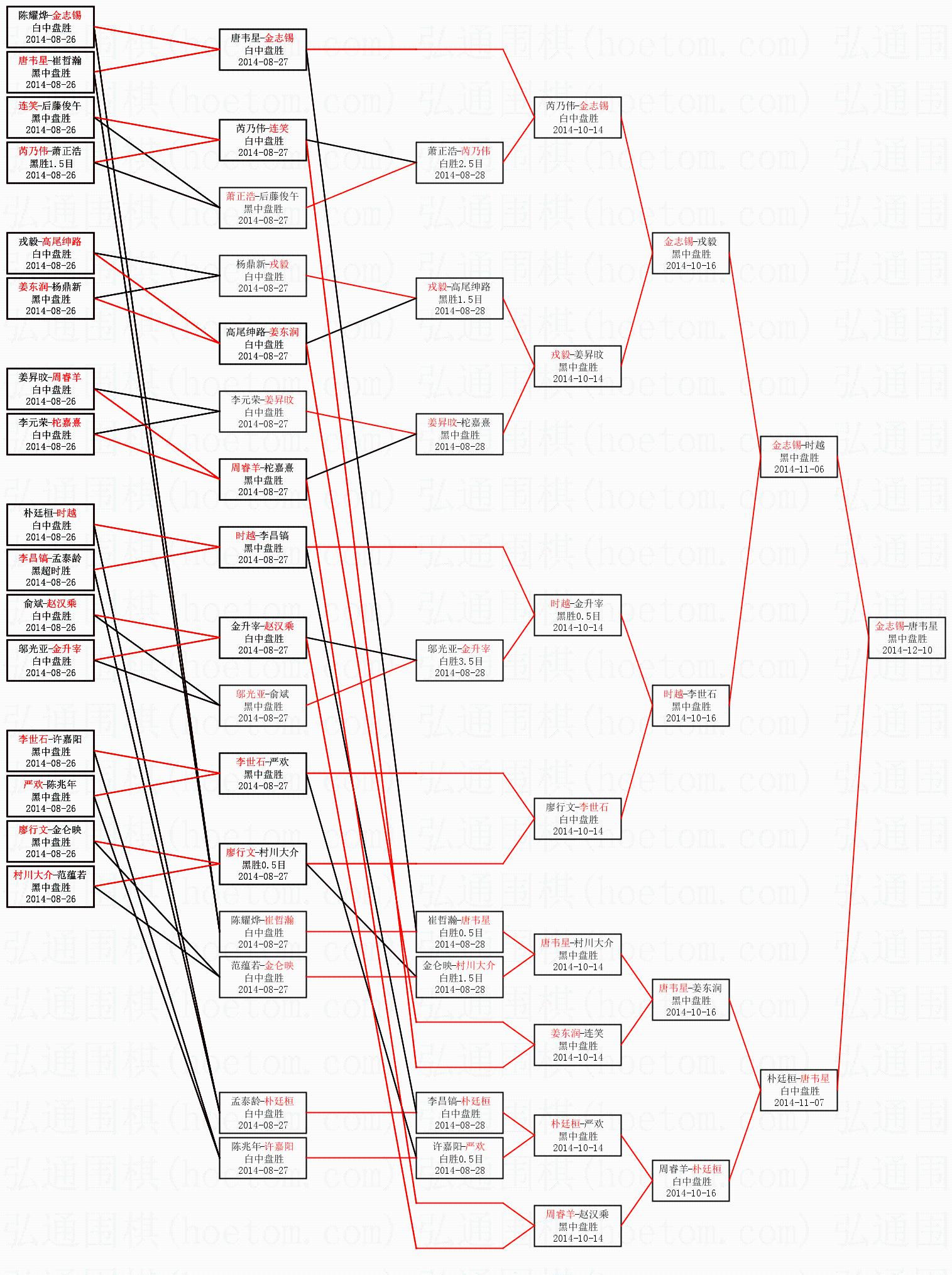 1.金志锡获得冠军,唐韦星获得亚军。决赛比分:金志锡2:0唐韦星。棋局: