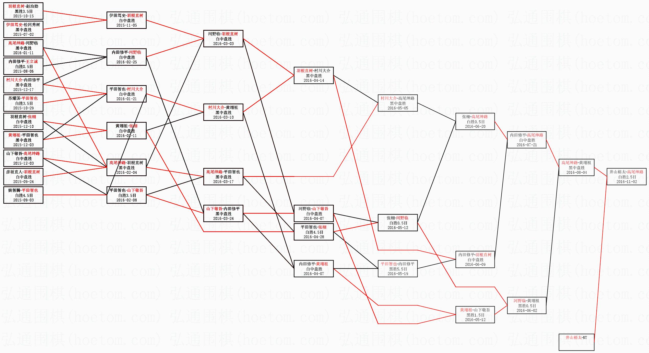 1.高尾绅路获得冠军,井山裕太获得亚军。决赛比分:高尾绅路4:3井山裕太。棋局: