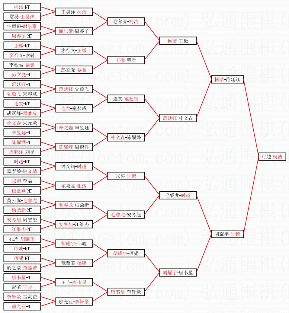 1.柯洁获得冠军,时越获得亚军。决赛比分:柯洁1:0时越。棋局:
