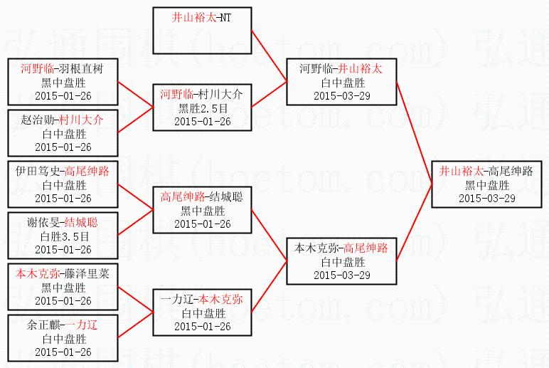 1.井山裕太获得冠军,高尾绅路获得亚军。决赛比分:井山裕太1:0高尾绅路。棋局: