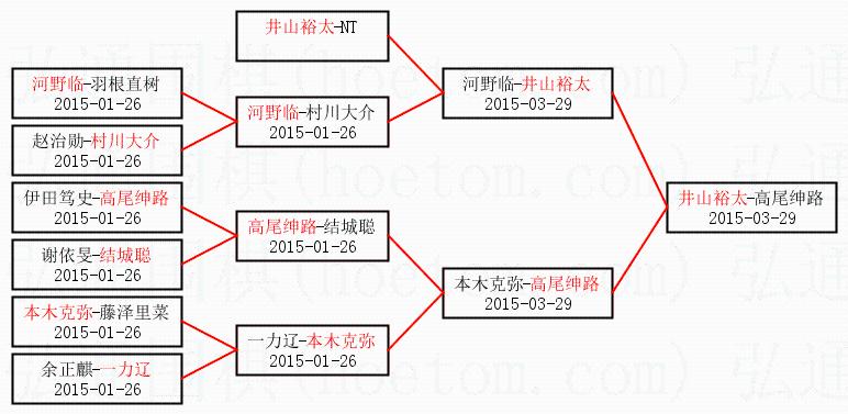 1.井山裕太获得冠军,高尾绅路获得亚军。决赛比分:井山裕太1:0高尾绅路。棋局: