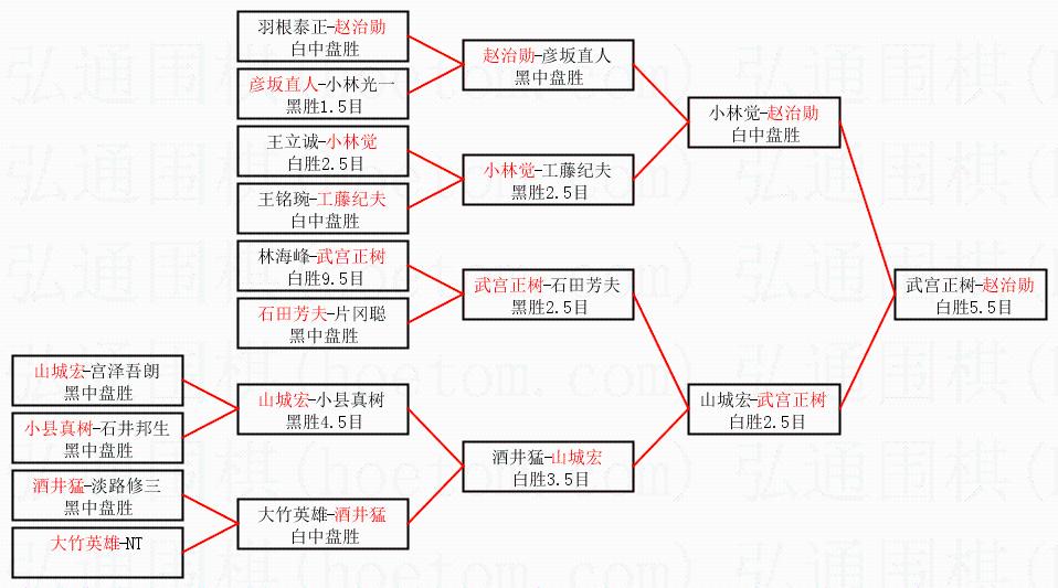 1.赵治勋获得冠军,武宫正树获得亚军。决赛比分:赵治勋1:0武宫正树。棋局: