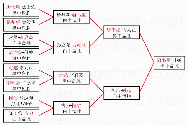 1.唐韦星获得冠军,时越获得亚军。决赛比分:唐韦星1:0时越。棋局: