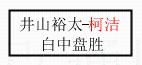 1.柯洁获得冠军,井山裕太获得亚军。决赛比分:柯洁1:0井山裕太。棋局: