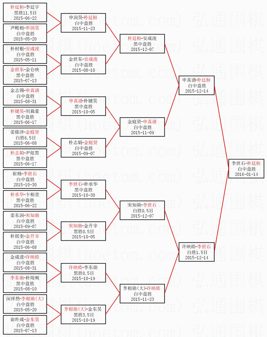 1.朴廷桓获得冠军,李世石获得亚军。决赛比分:朴廷桓2:1李世石。棋局: