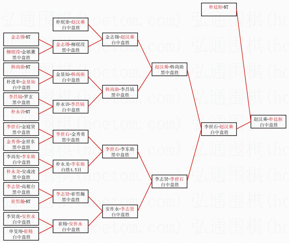 1.朴廷桓获得冠军,赵汉乘获得亚军。决赛比分:朴廷桓3:0赵汉乘。棋局: