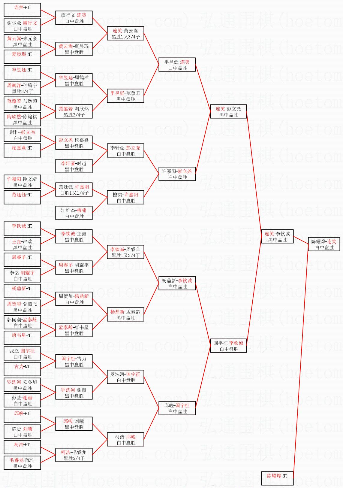 1.连笑获得冠军,陈耀烨获得亚军。决赛比分:连笑3:0陈耀烨。棋局: