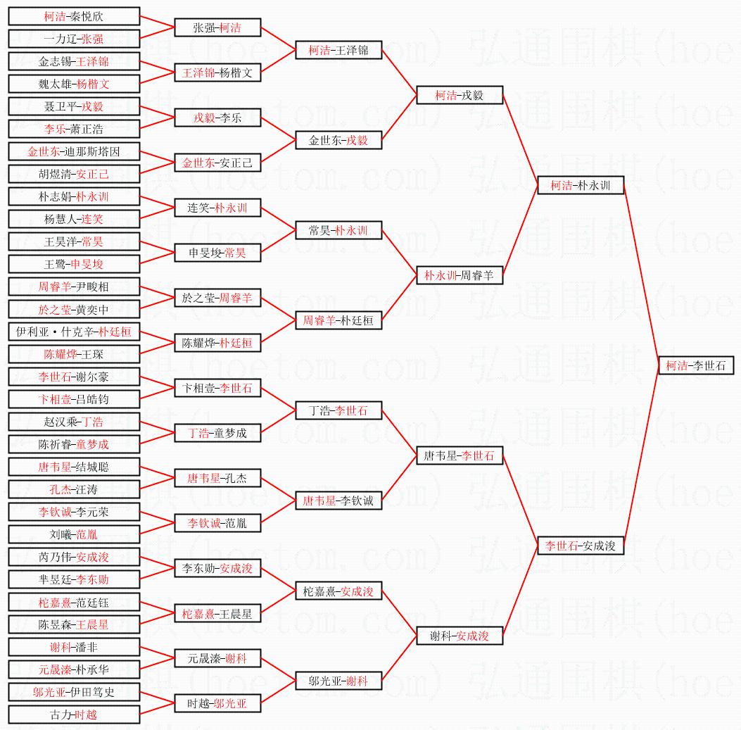 | 1.柯洁获得冠军,李世石获得亚军。决赛比分:柯洁3:2李世石。棋局: | ||