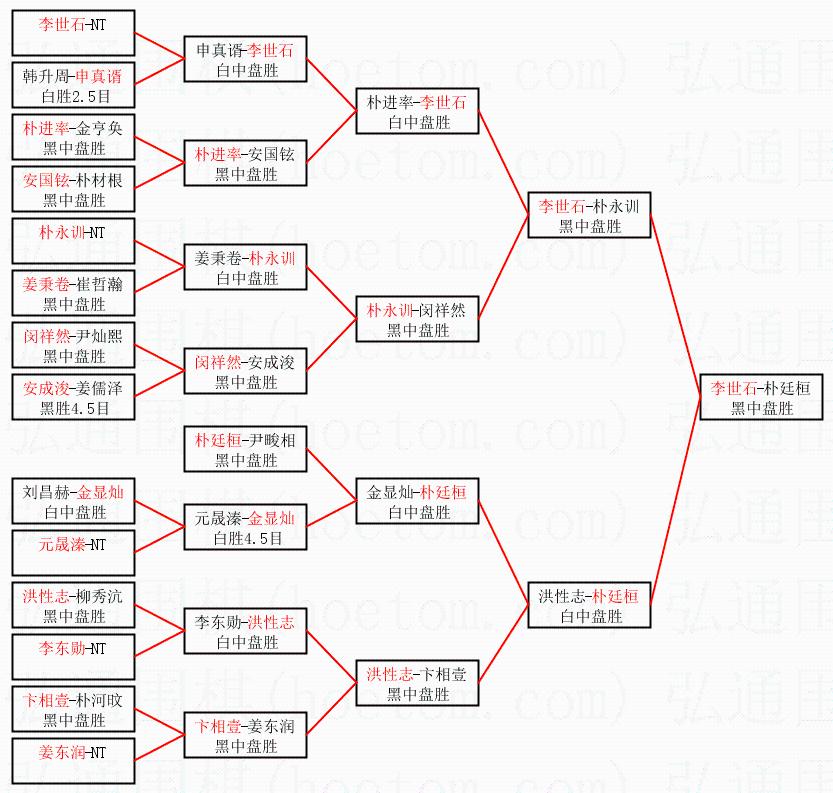 | 1.李世石获得冠军,朴廷桓获得亚军。决赛比分:李世石3:1朴廷桓。棋局: | ||