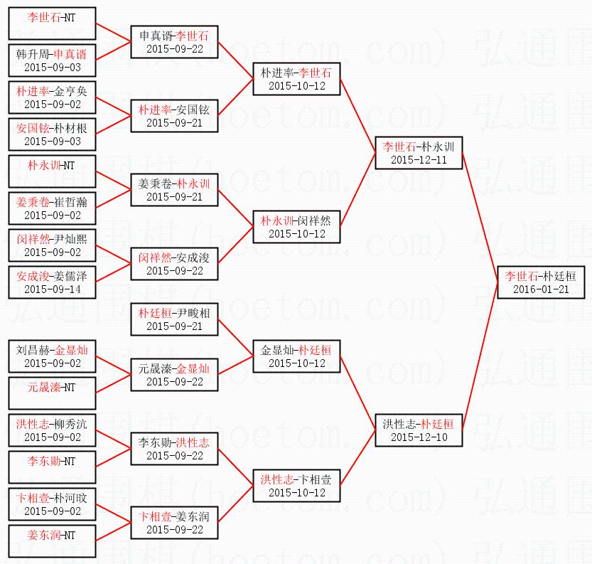 | 1.李世石获得冠军,朴廷桓获得亚军。决赛比分:李世石3:1朴廷桓。棋局: | ||