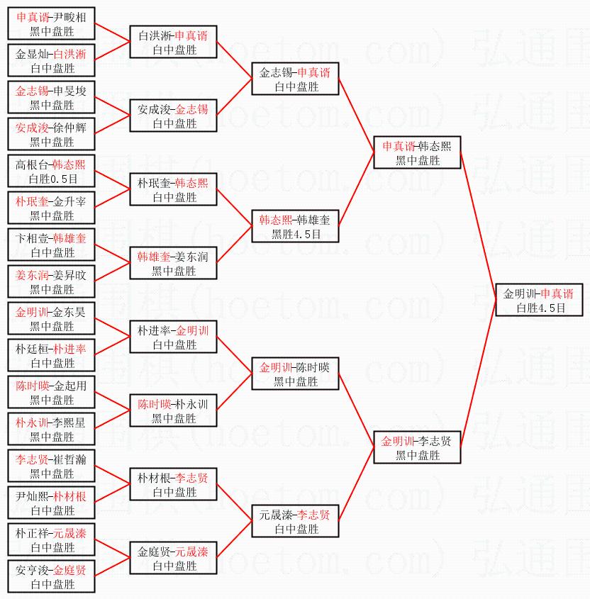 1.申真谞获得冠军,金明训获得亚军。决赛比分:申真谞2:1金明训。棋局: